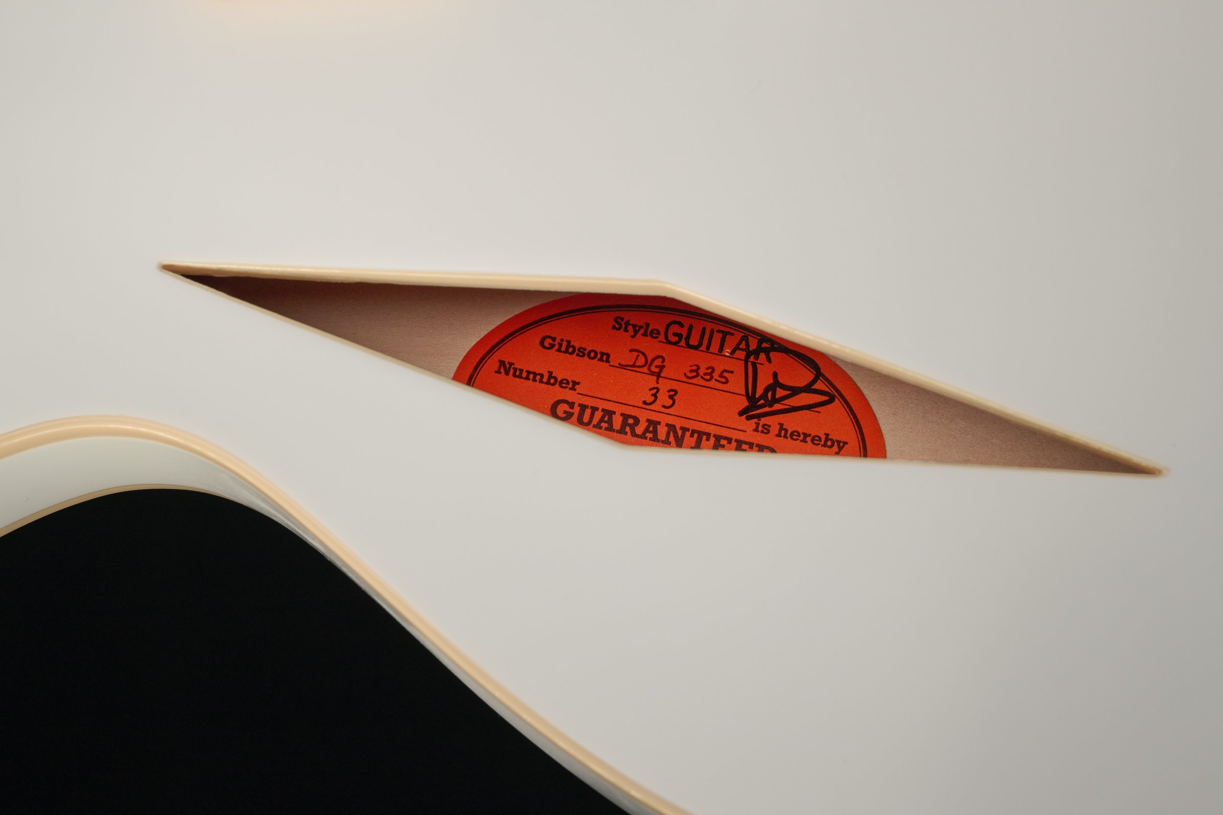 Above: Gibson DG-335 in Alpine White, with the label signed by Dave Grohl inside the f-hole.